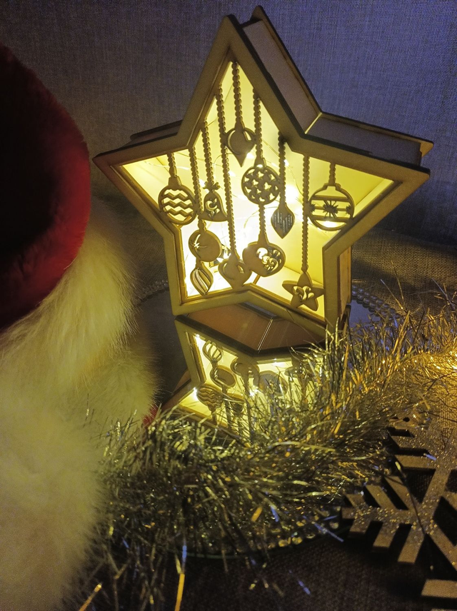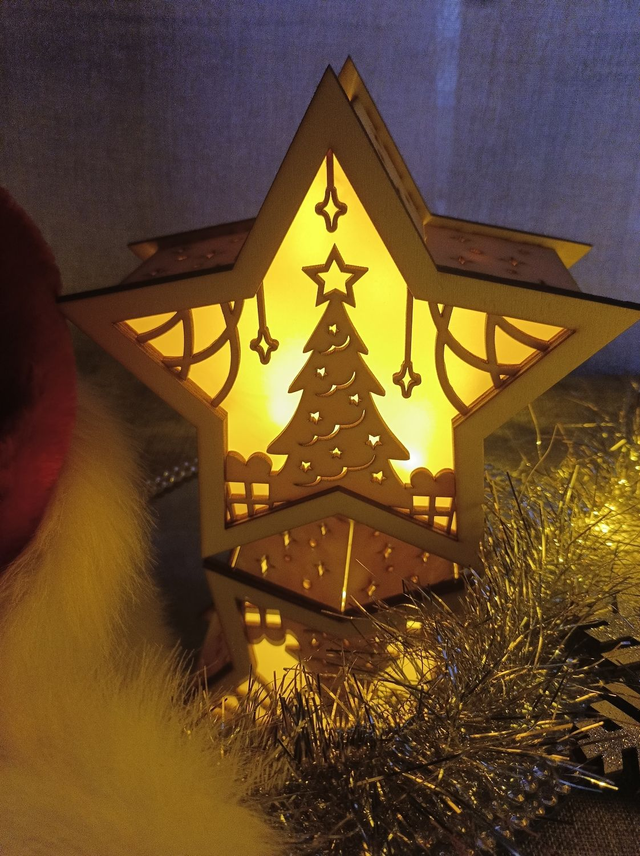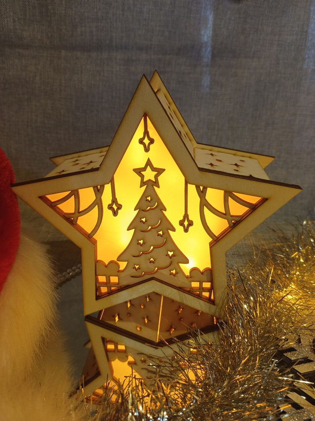 Lumière étoile dans le thème de Noël (d'autres thème possible). Accompagné d'une guirlande LED fonctionnant à pile AA.